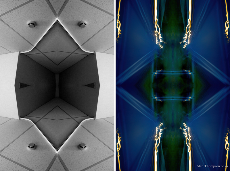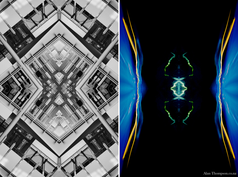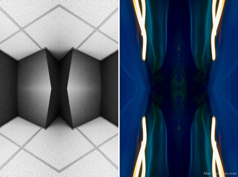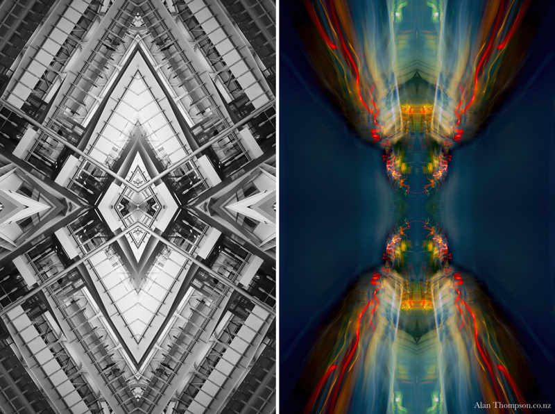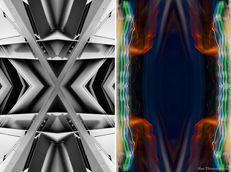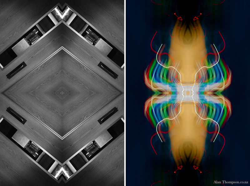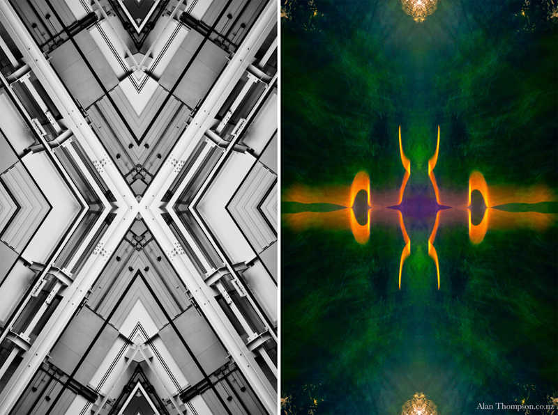 The work presents two sides of my personality. I have used my camera to capture images, which I have treated to produce symmetrical reflections. My world is a collage of impressions.